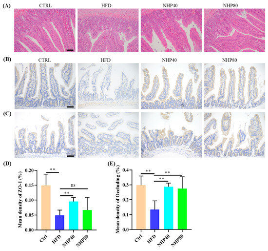 Hematoxylin and eosin (H&E) staining (Figure 2A) demonstrated that HFD induced abnormal proliferation of goblet cells, damage to lamina propria, and villous atrophy, thereby disrupting submucosal architecture. In contrast, NHP treatment not only effectively suppressed abnormal proliferation of goblet cells but also mitigated lamina propria damage and reversed villous atrophy. This led to the restoration of the submucosal architecture to a more normal state, as evidenced by the significant improvement in histological appearance compared to the HFD group. Compared to CTRL, immunohistochemical (IHC) staining revealed that HFD decreased levels of ZO-1 (Figure 2B,D, p < 0.01) and Occludin (Figure 2C,E, p < 0.01) in the ileum. NHP enriched the expression of ZO-1 (p < 0.01) and Occludin (p < 0.01), indicating enhanced intestinal tight junctions. These proteins significantly regulated cell polarity and apical domain development and impacted crucial cellular activities, including proliferation, differentiation, and migration [21]. Impairment of tight junctions might have indicated severe gastrointestinal pathologies [22]. Prolonged exposure to HFD elevates oxidative stress, leading to a lack of tight junctions and significantly affecting the integrity of the gut epithelial barrier. However, there was no significant difference in the expression of ZO-1 and Occludin levels between the NHP40 and NHP80 groups. This is probably because NHP can exert a beneficial activity in promoting the expression of ZO-1 and Occludin, even at a relatively low concentration.