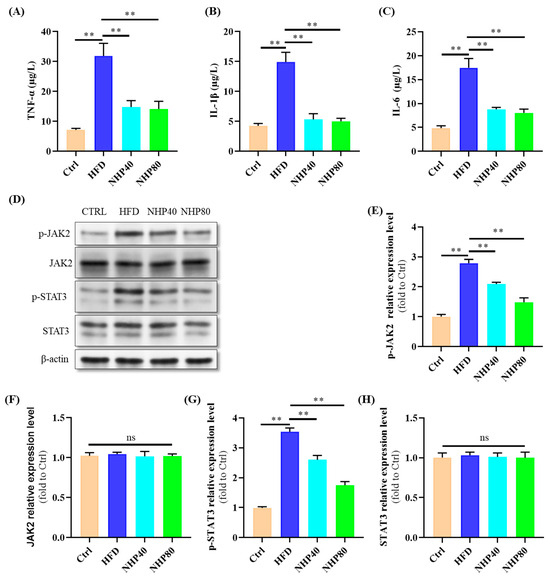 Figure 3A–C illustrate the potent anti-inflammatory efficacy of NHP, as evidenced by a significant reduction in the levels of TNF-α, IL-1β, and IL-6 (p < 0.01). Elevated circulating levels of TNF-α, IL-1β, and IL-6 are indicative of inflammation [23]. These findings suggest that NHP treatment attenuated HFD-induced inflammation. Figure 3D,E–H correspondingly reveal an amplification of JAK2/STAT3 signaling in HFD rats compared to Ctrl (p < 0.01), and dose-dependent suppression of p-JAK2 and p-STAT3 proteins by NHP was observed. Specifically, p-JAK2 protein expression decreased from 2.79-fold in the HFD group to 2.09-fold in NHP80 and 1.48-fold in NHP40, respectively. Similarly, p-STAT3 protein expression declined from 3.54-fold in the HFD group to 2.60-fold in NHP80 and 1.75-fold in NHP40, respectively. In conclusion, NHP effectively counteracted HFD-induced inflammation by activating the JAK2/STAT3 pathway. In a high-fat environment, excessive lipid accumulation occurs within cells. Such metabolic stress can cause certain intracellular stress signals to converge and activate the JAK2/STAT3 pathway. When activated, this pathway regulates the expression of many metabolic genes. For example, it may upregulate the expression of genes related to fatty acid synthesis, exacerbating intracellular lipid accumulation [24]. Consequently, the findings suggest that NHP reduces fat accumulation by reducing the activation of the JAK2/STAT3 pathway.