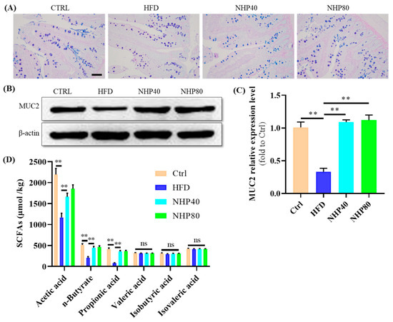 In addition to its beneficial effects on lipid metabolism and inflammation, NHP also exhibited a role in maintaining the integrity of the colonic mucosa. Figure 4A shows a reduction in Alcian Blue-Periodic Acid-Schiff (AB-PAS)-stained areas during chronic HFD intake. NHP treatment counteracted HFD-induced depletion of goblet cells. Western blot analysis showed that the expression level of MUC2 protein in the ileal tissue of the HFD group was significantly reduced (Figure 4B,C). Quantitatively, it was found to be only 0.33 times that of the Ctrl group, with a statistically significant difference (p < 0.01). Interestingly, NHP significantly increased the relative expression of this protein (p < 0.01). AB-PAS staining is a widely used technique to detect intestinal and gastric mucous substances. In this method, glycogen and neutral mucous substances stain red, while acidic substances stain blue. The intestinal mucosal layer is vital in forming the mucosal barrier, with MUC2 being the primary mucin component. Thus, NHP mitigated HFD-induced colon mucosa damage by reducing inflammation. The mucosa layer of the intestine serves as an important barrier structure. When the intestinal mucosal barrier malfunctions, infections, toxic substances, and other dangerous agents can more easily penetrate the mucosal layer. Upon recognition of foreign infections by immune cells, an inflammatory reaction is initiated [5]. In this study, NHP treatment was found to reduce damage to the intestinal mucosal layer. By modulating certain molecular pathways, such as the JAK2/STAT3 pathway, NHP reduced inflammation, thereby mitigating the damage caused by HFD in colon mucosa.