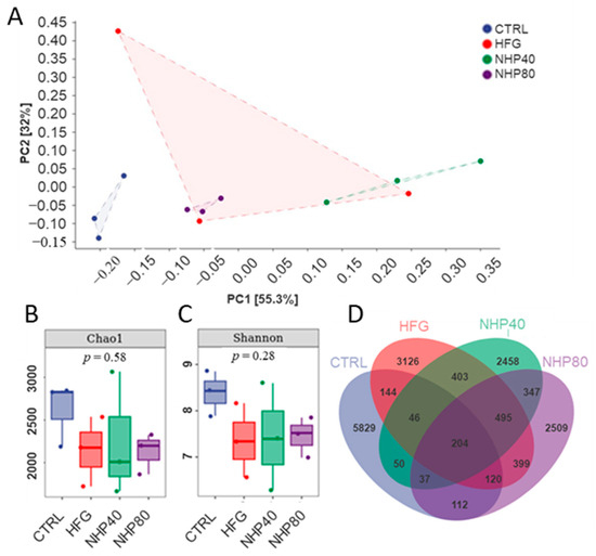 PCA analysis (Figure 5A) revealed the distinct positioning of Ctrl in the lower left corner, demonstrating a significant impact of HFD on gut flora. The NHP40 and NHP80 groups exhibited unique features from the HFD and Ctrl groups, suggesting partial restoration of HFD-induced alterations by NHP. Figure 5B,C illustrates a decrease in species richness and evenness in rats fed the HFD compared to Ctrl. However, NHP treatment did not significantly alter these parameters. As depicted in Figure 5D, NHP affected gut population composition. Shared amplicon sequence variants (ASVs) of 514, 337, and 473 were observed for Ctrl and HFD, Ctrl and NHP40, and Ctrl and NHP80, indicating NHP-induced shifts in gut microbiota composition. The Chao1 index represents species richness, and the Shannon index measures species evenness. After NHP treatment, there were no significant differences in Chao1 and Shannon gut microbiota indices. Based on the above results, we believe that NHP may play a regulatory role by regulating the spatial distribution, activity status, or metabolic activity status of the gut microbiota.
