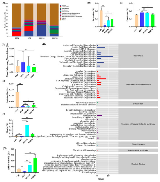At the genus level, the gut microbiota consisted mainly of genera including Blautia, Lactobacillus, Akkermansia, Oscillospira, Allobaculum, Bacteroides, Clostridium, Phascolarctobacterium, Turicibacter, and SMB53 (Figure 6A). Compared to Ctrl, the proportion of Bacteroidetes decreased significantly in HFD (p < 0.01) (Figure 6B), while Firmicutes increased substantially (p < 0.05) (Figure 6C). This indicates that HFD treatment notably enhanced the Firmicutes/Bacteroidetes (F/B) ratio. Administration of NHP resulted in a significant increase in Bacteroidetes and a reduction in Firmicutes proportions in a dose-dependent manner (p < 0.05). Previous studies have shown that an elevated F/B ratio in the HFD group is associated with nutrient accumulation, adipogenesis, and fat storage [29]. Thus, the reduced F/B ratio may be related to NHP’s protective role against glycolipid metabolism disorders. As shown in Figure 6D, there was no significant difference in the abundance of Clostridium levels among each group (p > 0.05). Lactobacillus, which produces lactic acid and plays a crucial role in maintaining the intestinal mucosal barrier, regulating the immune system, and promoting digestion and absorption [30], exhibited a significant increase in abundance in the NHP80 group (p < 0.05) (Figure 6E). Research by Hosimi et al. [31] has shown that higher levels of Blautia suggest a smaller visceral fat area. In vitro and in vivo experiments have also confirmed Blautia’s ability to reduce BW gain, inflammation, and insulin resistance [32]. Consequently, this bacterium has emerged as a key obesity-related gut bacterium [31]. In this study, NHP treatment significantly increased Blautia abundance (Figure 6F). The increase in beneficial bacteria such as Blautia may contribute to improved lipid metabolism through mechanisms such as enhanced bile acid metabolism and reduced inflammation-induced insulin resistance. A low level of Akkermansia in the intestine may lead to thinning of the mucosa, leading to a weakening of the intestinal barrier function and making it easier for toxins to invade the host [33]. Fortunately, after NHP treatment, the level of this bacterium increased significantly (Ctrl: 0.027%, HFD: 0.009%, NHP40: 0.064%, NHP80: 0.122%, p < 0.01) (Figure 6G). To clarify the potential mechanism by which the gut microbiota affects the organism, this study used PICRUSt2 to perform functional sequencing on the results of abundance of all samples in secondary pathways. Results (Figure 6H) reveal that the differential gut microbiota focused primarily on biosynthesis, particularly amine, polyamine, fatty acid, nucleotide, and cofactor biosynthesis. In addition, previous studies [14,16,34] have shown that polyamines exert effects on renewing and repairing intestinal epithelial cells and maintaining the integrity of the intestinal barrier. Meanwhile, fatty acids play a crucial role in maintaining the function of the intestinal barrier. These findings suggest that NHP effectively alleviates elevated HFD-induced inflammation and potentially preserves the structural integrity of intestinal epithelial tissue by modifying the gut microbiota.