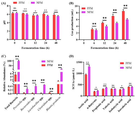 In vitro fermentation culture results. (A) pH change, (B) gas production, (C) SCFAs concentrations, and (D) intestinal microbiota composition in fermentation cultures. n = 3. * p < 0.01, ** p < 0.01, ns: no significant difference.