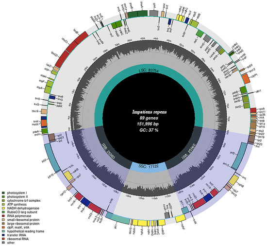 By using Illumina MiSeq (Illumina Corporation, San Diego, CA, USA) sequencing, the reads were filtered, and the data were analysed to obtain that the length of the chloroplast genomes of the nine Impatiens species ranged from 150,810 bp (I. rectirostrata) to 152,345 bp (I. blepharosepala) (Table 1). The chloroplast genomes of all nine Impatiens species in this study were typical of circular DNA molecules, and the GC content in each region matches the published chloroplast genome of Impatiens plants (Figure 1 and Figures S1–S8). Like most angiosperms, the Impatiens chloroplast genome also exhibits a typical four-part structure, with the IR region ranging from 25,560 bp (I. repens) to 25,834 bp (I. blepharosepala) being complemented by the LSC region of 8020 bp (I. rectirostrata) to 83,754 bp (I. repens) and SSC region 17,122 bp (I. repens) to 17,616 bp (I. rectirostrata). The GC content in the chloroplast genomes of all nine Impatiens species was 37% (Table 1). And the GC content was distributed differently among the regions, with the GC content in the IR region being higher than that in the LSC region, which in turn was higher than that in the SSC region (Table 1). The number of genes in I. repens, I. rectirostrata, I. rostellata, and I. distracta was 147, 165, 147, and 166, of which 94, 104, 105, 94, and 105 were protein coding genes, respectively, and 12 rRNA genes in all of them, 41 tRNA genes in I. repens and I. rostellata, and 49 genes in the rest of the 2 species; I. baishaensis, I. faberi, I. oxyanthera, I. tienchuanensis, and I. blepharosepala had similar numbers of genes, 132, 133, 130, 130, and 132, respectively, of which 87, 88, 85, 85, and 87 were protein-coding genes, 8 were rRNA genes, and 37 were tRNA genes, respectively. The proteins encoded by these genes are involved in photosynthesis, self-replication, and others, among which unknown proteins are also present (Table 2 and Tables S1–S8). Of these, nineteen were intron-containing genes, and sixteen contained an intron (ndhA, ndhB, petB, petD, atpF, rpl16, rpl2, rps16, rpoC1, trnA-UGC, trnG-GCC, trnG-UCC, trnI-GAU, trnK-UUU, trnL-UAA, and trnV-UAC), and three contained two introns (rps12, clpP1, and pafI).