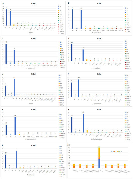 In this study, SSR analysis of nine species of Impatiens plants yielded a total of 778 SSR sequences, which were 661 mononucleotides, accounting for 85.0% of the total; 36 dinucleotides, accounting for 4.6% of the total; 41 trinucleotides, accounting for 5.3% of the total; 36 tetranucleotides, accounting for 4.6% of the total; and 4 pentanucleotides, accounting for 0.5% of the total; hexanucleotides were not detected; the highest number was of single-nucleotide sequences, followed by trinucleotide sequences, and the lowest number was of pentanucleotides; the number of SSRs in I. repens was the highest, 99, of all the species, and the lowest was 76 in I. blepharosepala, as shown in Figure 3a–i.