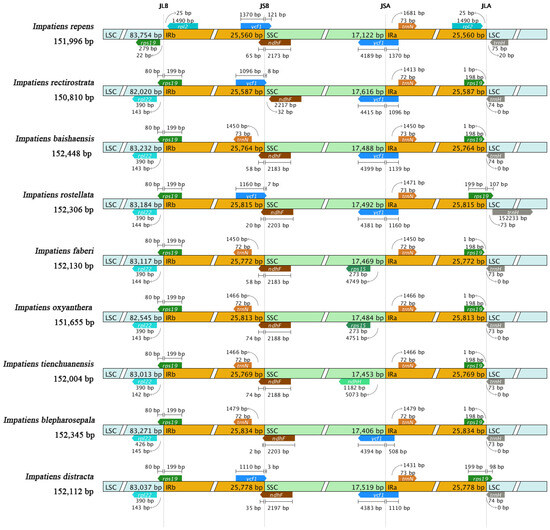 Variability in the location of the region was analysed by comparing the border region of the large single copy region, the reverse repeat, and the small single copy region of the cpDNAs of nine Impatiens plant species by the online tool IRscope (https://irscope.shinyapps.io/irapp/ (accessed on 29 July 2024)) [78].