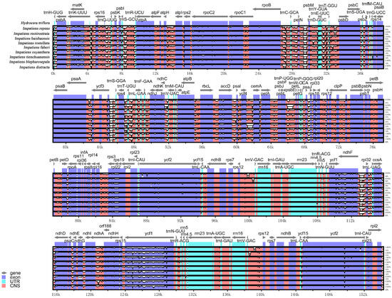 Using an online tool, mVISTA (https://genome.lbl.gov/vista/mvista/submit.shtml (accessed on 2 August 2024)) [79], the cpDNA of Hydrocera triflora was used as a reference sequence to visualise and analyse nine Impatiens plants, which reflected conserved versus variant regions among species by comparing the differences between exons, introns, non-coding, and coding regions of the chloroplast genome.