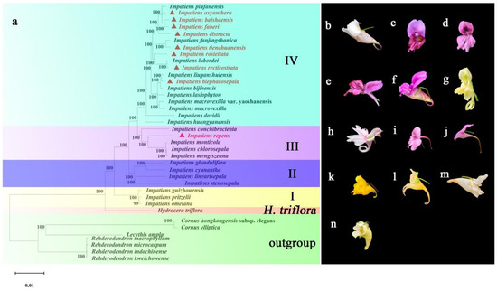 - Qiu, H.; Zhang, Z.H.; Wang, M.Z.; Jin, X.J.; Lin, J.D.; Comes, P.H.; Chen, J.X.; Cui, R.N.; Duan, R.Q.; Li, P. Plastome evolution and phylogenomics of Impatiens (Balsaminaceae). Planta 2023, 257, 45. [Google Scholar] [CrossRef]