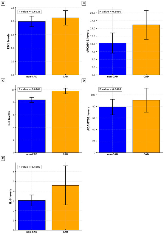 Circulating biomarkers levels in non-CAD and CAD groups: (A). Endothelin-1 (ET-1); (B). soluble vascular cell adhesion molecule-1 (sVCAM-1); (C). Interleukin-8 (IL-8); (D). a disintegrin-like and metalloproteinase with thrombospondin motif 1 (ADAMTS-1); (E). Interleukin-6 (IL-6).