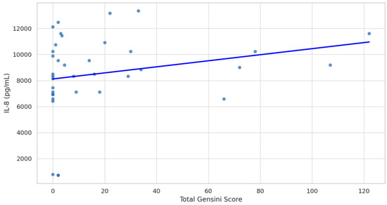 Statistical analysis was performed using Statistica software version 13.3. Categorical variables are expressed as numbers and percentages. Quantitative variables are presented as mean (M) with standard deviation (SD) for normally distributed variables or median (Me) with interquartile range (IQR) for non-normally distributed variables. Statistical significance was set at 0.05. The Shapiro–Wilk test was used to assess the normality of data distribution. The homogeneity of variances was evaluated using Levene’s test. For comparisons between the two groups (CAD vs. non-CAD), Student’s t-test was applied for normally distributed variables with equal variances, and the Mann–Whitney U test was used for non-normally distributed variables. Categorical variables were compared using the χ2 test. Correlations were analyzed between Gensini Score and IL-8 levels, and Spearman’s rho coefficient was estimated.