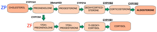 Aldosterone is one of the major hormones produced by the adrenal gland: the cortex of the adrenal glands is composed of three zones, the zona glomerulosa (ZG), the zona fasciculata (ZF), and the zona reticularis (ZR). The cells of each zone are responsible for the secretion of different types of adrenal hormones. Mineralocorticoids such as aldosterone are produced in the ZG, whereas ZF cells produce glucocorticoids and ZR cells mainly produce adrenal androgens (Figure 2) [8].