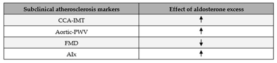 Ambrosino et al. analysed a number of the parameters mentioned above in participants with EH, with PA, and without hypertension from 12 case–control studies in total and reported that those who suffered from PA had a higher CCA-IMT and aortic PWV than EH and normotensive groups. Furthermore, Aix, as well as AIx normalised to a heart rate of 75 beats per minute (AIx@75), were higher, and FMD was lower, in patients with PA compared to normotensives [18]. In general, these data demonstrate that aldosterone itself enhances the progression of subclinical atherosclerosis.