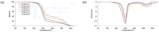 TG (a) and DTG (b) curves for the tested compounds in inert conditions.