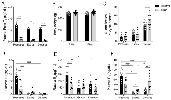 Confirmation of hypothyroidism and evaluation of body weight, reproductive cycles, and hormone levels in hypothyroid rats throughout the estrous cycle. (A) Plasma dosage of free T4; (B) body weight; (C) quantification of the phases of the estrous cycle; (D) plasma concentration of LH; (E) plasma concentration of estradiol (E2); (F) plasma concentration of progesterone (P4). Significant differences were determined by Student’s t-test between groups (*) and ANOVA followed by the Student–Newman–Keuls (SNK) test for different phases of the cycle (#); n= 6–7 animals/group; legends: */# p < 0.05; **/## p < 0.01; *** p < 0.001; ****/#### p < 0.0001; LH—luteinizing hormone; P4—progesterone; E2—estradiol.