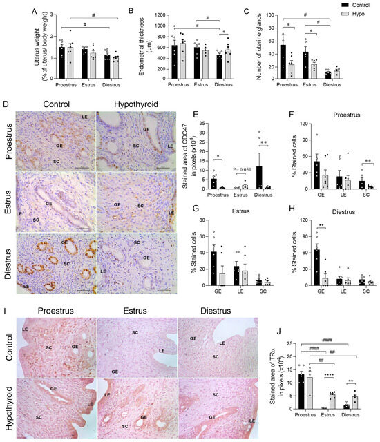 Uterine morphology, proliferative activity, and TRα endometrial immunostaining in hypothyroid rats throughout the estrous cycle. (A) Uterine weight; (B) endometrial thickness; (C) number of endometrial glands. (D) Photomicrographs of the immunohistochemical expression of CDC47 in the endometrium (streptavidin-biotin-peroxidase method; counterstained with Harris hematoxylin; scale bar = 50 μm); (E) immunolabeling area of the expression of CDC47, measured in pixels. (F–H) Percentage of cells immunolabeled for CDC47 on proestrus (F), estrus (G), and diestrus (H). (I) Photomicrographs of the immunohistochemical expression of TRα in the endometrium (streptavidin-biotin-peroxidase method; counterstained with Harris hematoxylin; scale bar = 50 μm); (J) immunolabeling area of the expression of TRα, measured in pixels. Significant differences were determined by Student’s t-test between groups (*) and ANOVA followed by the Student–Newman–Keuls (SNK) test for different phases of the cycle (#); n = 6–7 animals per group; legends: */# p < 0.05; **/## p < 0.01; ****/#### p < 0.0001; GE = glandular epithelium; LE = luminal epithelium; SC = stromal cells.