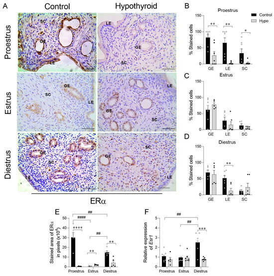 Expression of ERα in the uterus of hypothyroid rats throughout the estrous cycle. (A) Photomicrographs of the immunohistochemical expression for Erα in the endometrium (streptavidin-biotin-peroxidase; Harris hematoxylin; scale bar = 50 μm). (B–D) Percentage of cells immunolabeled for ERα in the luminal and glandular epithelium, as well as in the stroma, on proestrus (B), estrus (C), and diestrus (D). (E) Immunostaining area of ERα expression in the endometrium, measured in pixels. (F) Relative expression of the ESR1 gene. Significant differences were determined by Student’s t-test between groups (*) and ANOVA followed by the Student–Newman–Keuls (SNK) test for different phases of the cycle (#); n = 5–7 animals per group; legends: * p < 0.05; **/## p < 0.01; *** p < 0.001; ****/#### p < 0.0001; GE = glandular epithelium; LE = luminal epithelium; SC = stromal cells.