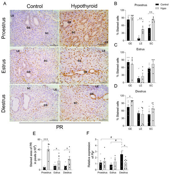 Expression of PR in the uterus of hypothyroid rats throughout the estrous cycle. (A) Photomicrographs of PR immunohistochemical expression in the endometrium (streptavidin-biotin-peroxidase method; counterstained with Harris hematoxylin; scale bar = 50 μm). (B–D) Percentage of cells immunolabeled for PR in the luminal and glandular epithelium and stroma on proestrus (B), estrus (C), and diestrus (D). (E) Immunostaining area of PR expression in the endometrium, measured in pixels. (F) Relative expression levels of the PGR gene. Significant differences were determined by Student’s t-test between groups (*) and ANOVA followed by the Student–Newman–Keuls (SNK) test for different phases of the cycle (#); n = 5–7 animals/group; */# p < 0.05; ** p < 0.01; *** p < 0.001; GE = glandular epithelium; LE = luminal epithelium; SC = stromal cells.