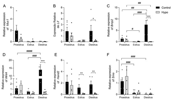 Expression levels of the MUC1, LIF, BMP2, WNT4, HAND2, and SMO genes in the uterus of hypothyroid rats throughout the estrous cycle. (A) Relative expression levels of the MUC1 gene in the uterus. (B) Relative expression levels of the LIF gene in the uterus. (C) Relative expression levels of the BMP2 gene in the uterus. (D) Relative expression levels of the WNT4 gene in the uterus. (E) Relative expression levels of the HAND2 gene in the uterus. (F) Relative expression levels of the SMO gene in the uterus. Significant differences between groups were assessed using Student’s t-test (*) and ANOVA followed by the Student–Newman–Keuls (SNK) test between the phases of the cycle (#); n = 4–7 animals/group; legends: */# p < 0.05; **/## p < 0.01; ***/### p < 0.001; #### p < 0.0001.