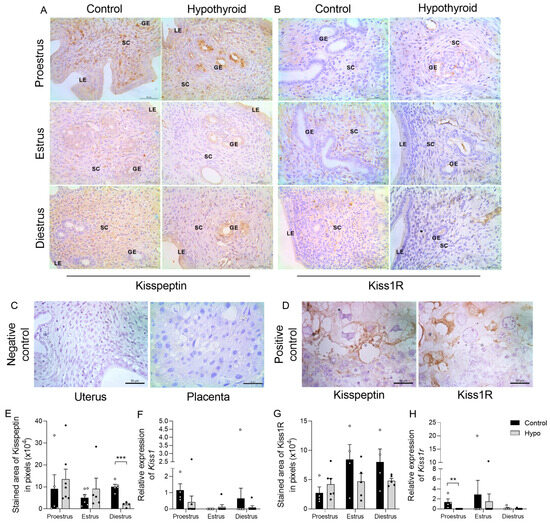 Expression of kisspeptin and Kiss1R in the uterus of hypothyroid rats throughout the estrous cycle. (A,B) Photomicrographs of the immunohistochemical staining for kisspeptin (A) and Kiss1R (B) in the endometrium (streptavidin-biotin-peroxidase; Harris hematoxylin; scale bar = 50 μm). (C,D) Negative control (rat uterus and placenta) (C) and positive control (rat placenta) (D) (streptavidin-biotin-peroxidase; Harris hematoxylin; scale bar = 50 μm). (E,G) Immunostaining area of kisspeptin (E) and Kiss1R (G) in the endometrium, measured in pixels. (F,H) Relative expression levels of KISS1 (F) and KISS1R (H). Significant differences between groups were assessed using Student’s t-test (*), and differences between the phases of the cycle were evaluated using ANOVA followed by the Student–Newman–Keuls (SNK) test; n = 4–7 animals/group; legends: ** p < 0.01; *** p < 0.001; GE = glandular epithelium; LE = luminal epithelium; SC = stromal cells.