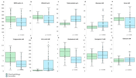 A total of 100 samples (50 for post-hatchlings and 50 for juveniles) was used for the targeted metabolomic analysis. The nutritional metabolites analyzed were non-esterified fatty acid (NEFA), albumin, total protein, glucose, urea, triglyceride, uric acid, cholesterol, inorganic P and calcium.