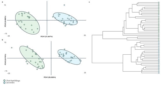 Figure 2 summarizes the results using untargeted metabolomics. Figure 2a,b depict the first two principal components obtained through the PLS-DA of the untargeted metabolomic data in positive and negative modes, respectively. As demonstrated, the variability linked to these principal components extracted from the metabolic profile (on average, 32% of the total) could effectively distinguish between physiological states as there was no overlap between the two ages. Furthermore, the dendrogram illustrated a strong classification of the samples, supporting the separation of metabolic profiles based on age. This indicates that the metabolic signatures of post-hatchling and juvenile animals are distinct and can easily be distinguished using untargeted metabolomics.