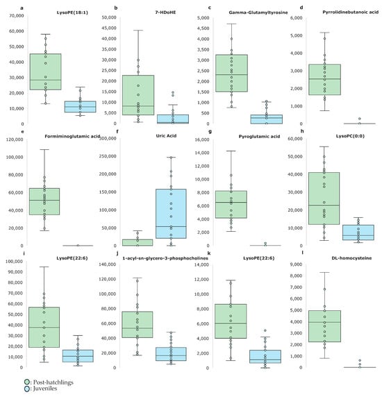 Effect of age on the main discriminant metabolites analyzed using the untargeted metabolomics of loggerhead sea turtles (Caretta caretta). (a) C23H46NO7P—LysoPE (18:1/0:0), (b) C22H32O3—7-HDoHE, (c) gamma-Glutamyltyrosine, (d) pyrrolidinebutanoic acid, (e) formiminoglutamic acid, (f) uric acid, (g) pyroglutamic acid, (h) C28H50NO7P—LysoPC (0:0/20:4), (i) C27H44NO7P—LysoPE (22:6/0:0), (j) C26H52NO7P—1-acyl-sn-glycero-3-phosphocholine, (k) C27H44NO7P—LysoPE (22:6/0:0), (l) DL-homocysteine. The units on the x-axis correspond with the peak area (n = 48; 24 post-hatchlings and 24 juveniles).