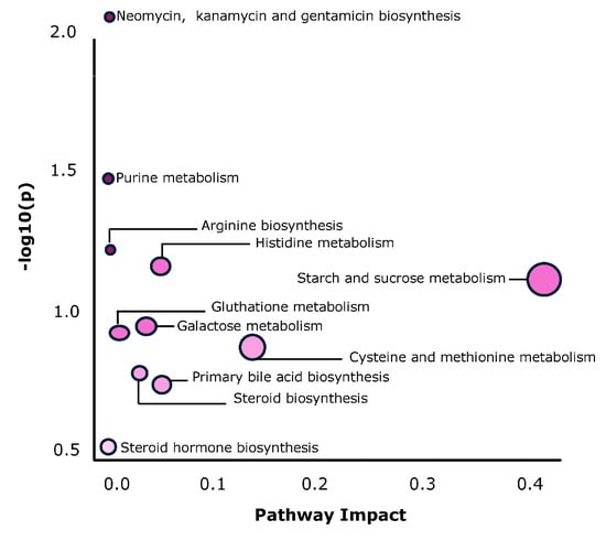 Figure 4 presents the pathway analysis plot, which aligns with the graphical summary of the analysis. In this figure, each matched pathway is depicted as a circle, highlighting neomycin, kanamycin and gentamicin bio-metabolism; starch and sucrose metabolism; and cysteine and methionine metabolism as the most enriched pathways. These findings indicate that the metabolic pathways related to amino-acid and carbohydrate metabolism were particularly prominent in both age groups, with distinct differences in their regulation between post-hatchling and juvenile animals.