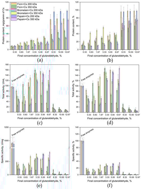 Ficin samples demonstrated acceptable specific activity when covalently immobilized to a chitosan matrix using 3.33 and 5% glutaraldehyde solutions, achieving slightly more than 20% of the specific activity of the free enzyme. High specific activity during ficin immobilization on high molecular weight chitosan was detected using a 3.33% glutaraldehyde solution, reaching 25% of the free enzyme’s specific activity. Papain showed higher specific activity when immobilized by covalent binding to medium molecular weight chitosan using a 5% glutaraldehyde solution, achieving 33% of the free enzyme’s specific activity. During covalent binding to high molecular weight chitosan, the highest specific activity of papain was observed with a 6.67% glutaraldehyde solution, reaching 36% of the free enzyme’s specific activity. Bromelain exhibited high specific activity when covalently bound to medium molecular weight chitosan using 0.33, 3.33, and 5% glutaraldehyde solutions, achieving 7 to 8% of the free enzyme’s specific activity. When covalently bound to high molecular weight chitosan, bromelain showed the highest specific activity with glutaraldehyde concentrations from 1.67 to 6.67%, achieving 25 to 30% of the free enzyme’s specific activity (Figure 1e,f).