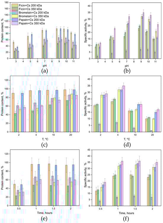 Protein content (left) and specific catalytic activity (right) for the samples of ficin, papain, and bromelain immobilized on chitosan matrix at various pH ((a,b): temperature 4 °C, time of immobilization—1 h), temperature ((c,d): pH 9.7, time of immobilization—1 h), and time of immobilization process ((e,f): temperature 4 °C, pH 9.7). Protein content and specific catalytic activity of ficin’s, papain’s, and bromelain’s solutions before enzyme’s immobilization were taken as 100%.