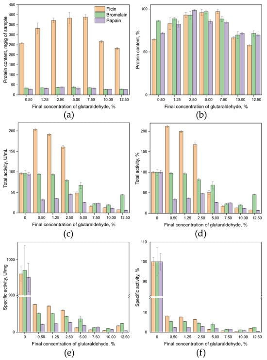 The total activity of ficin (units per mL of solution) was highest when immobilized with 0.5% glutaraldehyde, resulting in a 112% increase in activity compared to the free enzyme. Papain exhibited greater activity when immobilized with 2.5% glutaraldehyde, maintaining 48% of the activity of the free enzyme. Bromelain retained a high level of activity when immobilized with 0.5% glutaraldehyde, preserving 97% of the activity of the free enzyme (Figure 3c,d). The specific activity of all three enzymes during immobilization by the CLEAs method had low values and did not exceed 3–8% at all concentrations of glutaraldehyde used by us. (Figure 3e,f).
