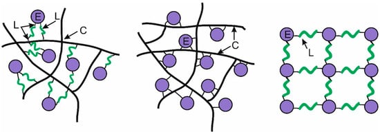 Variants of covalent immobilization of enzymes: the enzyme molecule (E, purple color), the carrier (C, black color), and the crosslinking reagent (L, green color).