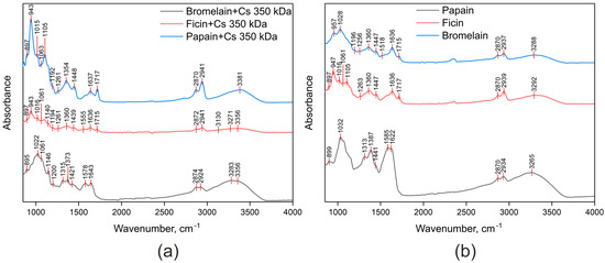 To identify the mechanisms of covalent immobilization of ficin, papain, and bromelain on the chitosan matrix and without carrier via the CLEAs method, we used FTIR.