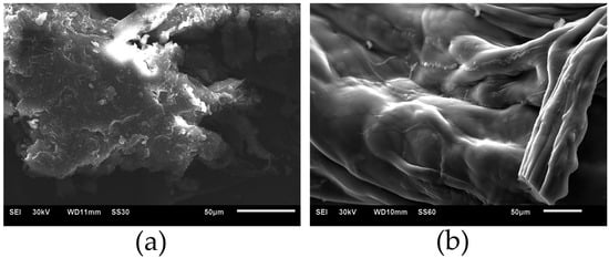 SEM data confirm changes in the surface of chitosan after the immobilization of cysteine proteases on it. Initially, chitosan has a scaly surface (Figure 6a), but after the immobilization of ficin on it, the protein–polysaccharide complex exhibits a smooth surface (Figure 6b).