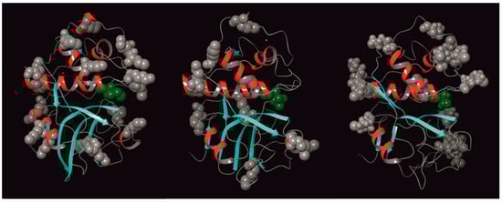Lys residues in ficin, PDB ID: 4YYW (left), papain, PDB ID: 9PAP (center), and bromelain, PDB ID: 1W0Q (right) molecules: the atoms of the amino acid residues in their composition are shown as balls. Cys from active site highlighted in green, and Lys residues highlighted in gray.