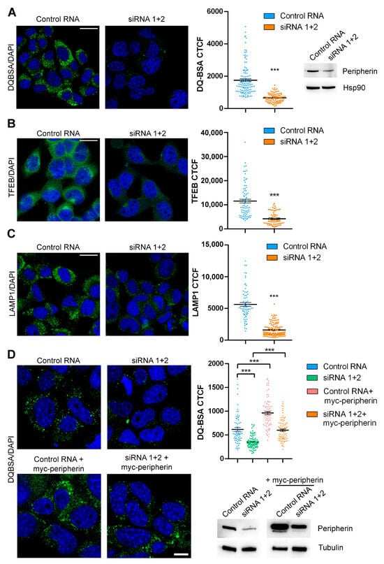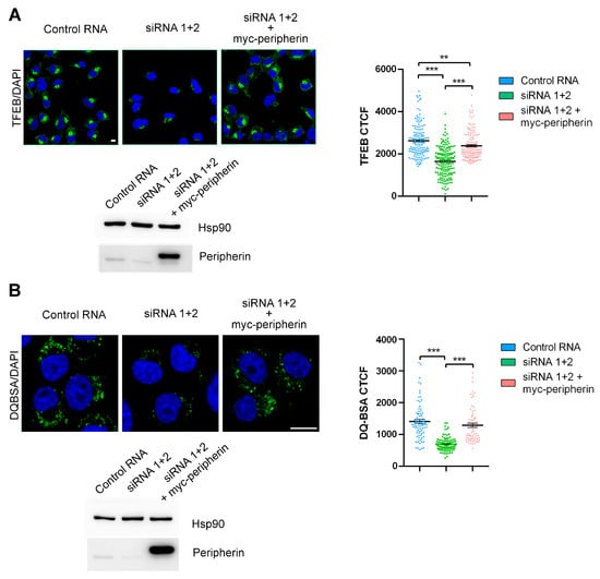 2.3. The Expression of Peripherin in Silenced Cells Rescues TFEB Abundance and Lysosomal Functionality