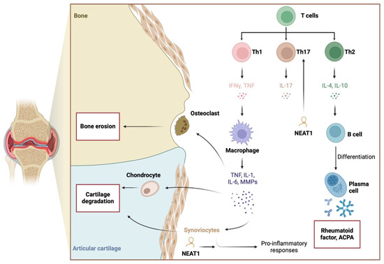 Pathogenesis of RA involves pro-inflammatory responses, to which NEAT1 is suggested to significantly contribute. The lncRNA stimulates the expression of pro-inflammatory cytokines and enhances the differentiation of Th17 cells. Created in BioRender. Kiełbowski, K. (2025) https://BioRender.com/c05i163.