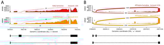 Sashimi plots illustrating statistically significant alternative splicing events by exon inclusion in the (A) Ank2 and (B) ATPalpha genes. The red histograms represent RNA-seq read coverage for sertraline-treated samples, while the orange histograms correspond to control samples. The black blocks indicate annotated genomic regions, and the connecting lines represent spliced regions. For Ank2, sertraline-treated samples exhibited higher exon inclusion levels compared to controls, suggesting a shift towards the long Ank2 isoform. Similarly, for ATPalpha, sertraline treatment promoted the inclusion of the long isoform, which is associated with enhanced neuronal functionality. Abbreviations: IncLevel—inclusion level, RPKM—reads per kilobase million.