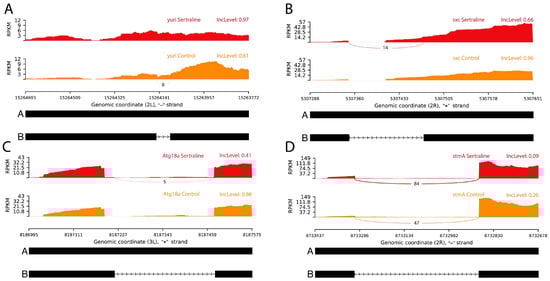 Sashimi plots displaying significant intron retention events in the genes (A) yuri, (B) sxc, (C) Atg18a, and (D) stmA. The red histograms represent RNA-seq read coverage for sertraline-treated samples, while the orange histograms correspond to control samples. The connecting lines represent spliced regions. For the yuri gene, intron retention was significantly higher in sertraline-treated samples compared to controls, suggesting a splicing alteration that could affect the expression of the functional isoform. For sxc, Atg18a, and stmA, sertraline treatment reduced intron retention, which may favor the expression of functional isoforms. Abbreviations: IncLevel—inclusion level, RPKM—reads per kilobase million.