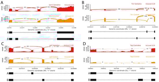 Sashimi plots displaying significant mutually exclusive exon splicing events in the genes (A) Sam-S, (B) Tm1, (C) gish, and (D) Tep2. The red histograms represent RNA-seq read coverage for sertraline-treated samples, while the orange histograms correspond to control samples. The connecting lines represent spliced regions. For Sam-S and Tm1, sertraline treatment increased the inclusion of alternative exons, while in gish, exon exclusion was observed. In Tep2, there was a higher inclusion of alternative exons following treatment. Abbreviations: IncLevel—inclusion level, RPKM—reads per kilobase million.