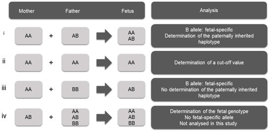 Parental SNV combinations separated into four different groups for NIPT analysis. (i) The determination of the paternally inherited fetal haplotype using SNVs for which the mother is homozygous and the father is heterozygous, enabling the detection of the fetal-specific allele that is absent from the maternal genome. (ii) The determination of the cut-off value of the assay, using SNVs for which both parents are homozygous for the same allele. (iii) The confirmation of the presence of fetal DNA in maternal plasma using SNVs for which both parents are homozygous but for different alleles. (iv) The determination of the fetal genotype using SNVs for which the mother is heterozygous.