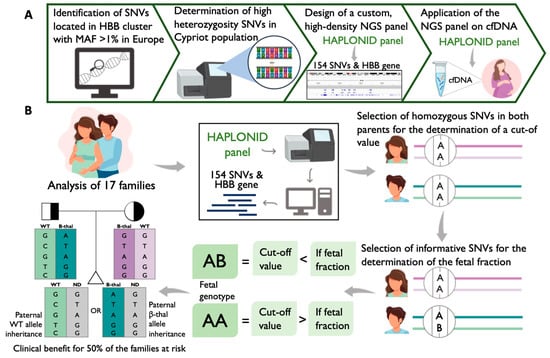 A schematic overview of the study. (A) A four-step process involving in silico identification of SNVs in the β-globin cluster, the determination of highly heterozygous SNVs in the Cypriot population, and the design of the HAPLONID NGS panel as well as its application to cfDNA samples. (B) The analysis of 17 families using the HAPLONID panel. Homozygous SNVs in both parents were selected to establish a family-specific cut-off value, while informative SNVs (where the mother is homozygous and the father is heterozygous) were used to determine the fetal fraction. If the fetal fraction exceeded the cut-off, it was inferred that the fetus had inherited the paternal fetal-specific allele B; if it was below the cut-off, the non-fetal-specific allele A was inferred. Fetal haplotypes were then constructed to provide diagnosis. In cases where the paternal wild-type (WT) allele was inherited, non-invasive prenatal diagnosis (NIPD) could characterize the fetus as either a carrier or as unaffected by β-thalassaemia. Conversely, if the paternal β-thal allele was inherited, the fetal status remained uncertain, precluding NIPD. This approach proved clinically beneficial for 50% of at-risk families.