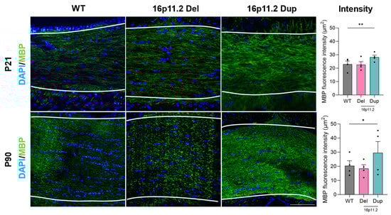 Myelin basic protein fluorescence intensity in the corpus callosum of 16p11.2 WT, deletion, and duplication mice at P21 and P90. Representative images at 10× for immunomarkers DAPI (blue) and MBP (green) in the corpus callosum (marked between the dashed lines) of 16p11.2 WT, deletion, and duplication mice at P21 and P90. Mean MBP fluorescence intensity (μm2) (n = 4 per genotype per time point). Significant increases in MBP fluorescence are seen between WT and 16p11.2 duplication mice (p < 0.01 **) at P21 and P90 (p < 0.05 *). Differences between 16p11.2 deletion and duplication mice with WT mice were assessed using a linear mixed effects model. A one-way ANOVA was performed, followed by multiple comparisons against the control group (WT) using Prism (Version 10.2.2). The analysis included data from four independent experiments, each consisting of three mice: 16p11.2 WT, deletion, and 16p11.2 duplication. Results are expressed as the mean ± SEM, with each data point representing an individual mouse. Scale bar: 100 µm.