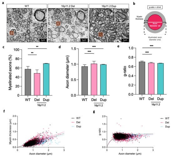 The analyses revealed a significant decrease in the percentage of myelinated axons in the corpus callosum of the 16p11.2 deletion mice when compared to the WT mice (Figure 4c, p < 0.01). Conversely, we found a significant increase in the percentage of myelinated axons in the corpus callosum of the 16p11.2 duplication mice when compared to the WT mice (Figure 4c, p < 0.01). These results illustrated mirrored percentages of the myelinated axons in the corpus callosum of the 16p11.2 deletion and duplication mice compared to the WT mice, highlighting a difference in the constitution of the corpus callosum regarding myelinated axon coverage.
