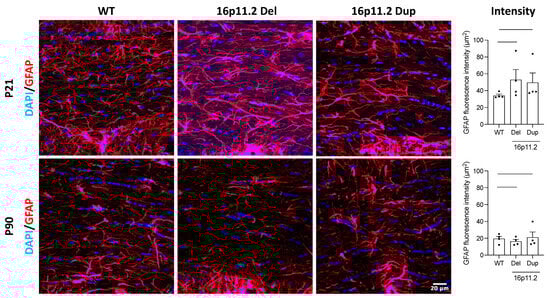 Given the importance of astrocytes in supporting oligodendrocytes, we performed further immunofluorescence staining for GFAP to investigate the effect of genotype on astrocyte populations. We found a significant increase in GFAP fluorescence intensity for both the 16p11.2 deletion (p < 0.001) and duplication (p < 0.01) mice compared to the WT mice at P21 (Figure 5). This suggested a significant increase in astrocytes in both the deletion and duplication mice at the P21 time point. At P90, significant differences were also identified. Here, however, we found a significant decrease in GFAP fluorescence intensity for the 16p11.2 deletion mice (p < 0.05) and a significant increase for the duplication mice (p < 0.001) (Figure 5). This suggested a significant reduction in astrocytes for the deletion mice compared to the WT mice at P90, while the duplication mice continued to exhibit increased numbers of astrocytes. Additionally, we observed an apparent decrease in GFAP fluorescence intensity across the genotypes between the P21 and P90 time points. This implied there were fewer astrocytes in all genotypes at this later time point.