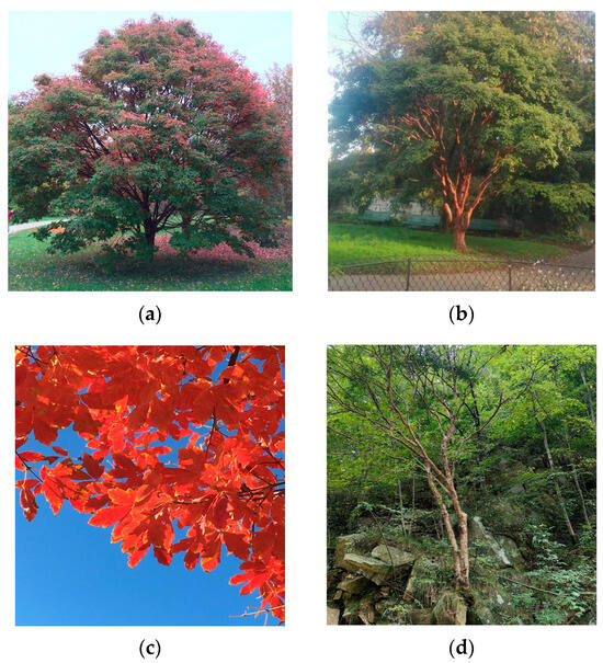 Acer griseum (Franch.) Pax (Sapindaceae Juss.) is an endangered tree species endemic to China, mainly distributed at an altitude of 800–1800 m as a subdominant tree species on steep slopes and cliffs in four mountains (Mt. Taihang, Mt. Qinling, Mt. Daba, and Mt. Wuling) spanning subtropical and temperate zones. It is of high ornamental value, not only because of its magnificent papery peeling, cinnamon to reddish-brown bark, but also because of its striking scarlet trifoliate foliage in autumn (Figure 1a–c). It can also serve as a prime candidate for specimen planting in gardens and residential landscape. Moreover, it is also a precious timber tree due to its hard wood. It was introduced to Europe by Ernest Henry Wilson from China in 1901 and then introduced to America in 1907. Until now, it has been planted in famous arboretums such as Arnold Arboretum and Kew Gardens []. At the end of the last century, it began to be cultivated in Beijing, Nanjing, and other cities in China. The Chinese government nominated A. griseum as a precious timber tree in 2017. As one of nine compound-leaf maples, A. griseum is of high value for scientific studies []. Investigations of natural populations found that strong inter-specific competition between A. griseum with local dominant species in natural habitat, less fruit bearing of mature trees, and natural regeneration difficulty combined with human logging has led to a gradual reduction of its natural populations [,]. Therefore, A. griseum has been categorized as an endangered species [,] and nowadays understanding the driving forces for its genetic diversity is of top priority for developing a genetic resources conservation strategy for the endangered A. griseum.