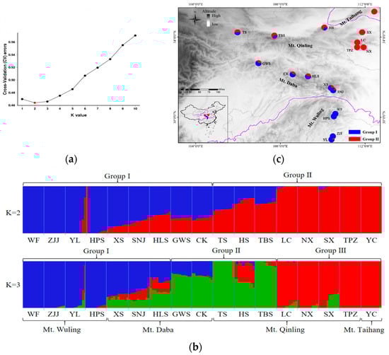 Genetic structure analysis of 17 populations in A. griseum. (a) Cross-validation (CV) errors for different K values in admixture. (b) Clustering analysis results of 17 populations in A. griseum by admixture (K = 2 and K = 3). (c) Clustering analysis results of 17 populations in A. griseum based on their geographic distribution (K = 2).