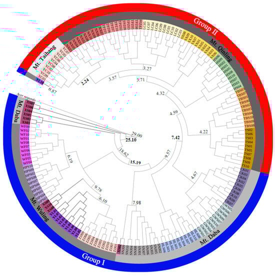 Phylogenetic analysis showed that 15 populations were clustered into monophyly except for the XS and YL populations. In addition, the populations located in the same mountain were primarily clustered together. The populations in Mt. Taihang were found to be closely genetic related with those in Mt. Qinling, while populations in Mt. Wuling were closely genetic related with those in Mt. Daba (Figure 3). The divergence time indicated that the XS population located in Mt. Daba diverged 25.10 million years ago (Mya). At 15.19 Mya, the populations located in Mt. Wuling diverged from the rest of the populations in Mt. Daba. Then, the populations located in Mt. Qinling diverged at 7.42 Mya, while the populations located in Mt. Taihang diverged at 2.24 Mya (Figure 3).