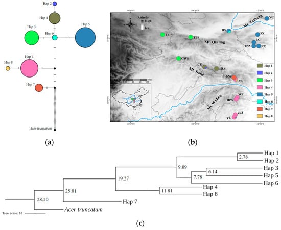 Haplotype network and divergence time of A. griseum. (a) Haplotype network map of A. griseum. (b) Geographical distribution of the eight haplotypes identified here, with one solid line between two haplotypes representing one mutational step. (c) Divergence time of eight haplotypes of A. griseum.