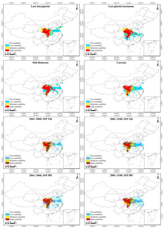 Under the current climate, the suitable habitat of A. griseum was 768,888 km2, of which the highly suitable habitat was 271,701 km2, the moderately suitable habitat was 136,024 km2, and the poorly suitable habitat was 361,163 km2, accounting for 35.34%, 17.69%, and 46.97%, respectively. Under the historical climate, the suitable habitat of A. griseum showed a trend of first increasing and then decreasing. During the Last Interglacial (LIG) period, the suitable habitat of A. griseum was the lowest, which was 702,396 km2. Subsequently, the suitable habitat increased to 796,528 km2 in the Last Glacial Maximum (LGM) period and decreased to 783,698 km2 in the Mid-Holocene (MH) period. In future, its suitable habitat will decrease first and then increase, with an overall declining trend. Under the shared socio-economic pathway 126 (SSP126, sustainable development path), the suitable habitat of A. griseum will decrease to 647,899 km2 from 2041 to 2060 and will increase to 720,538 km2 from 2081 to 2100. Similarly, under the SSP585 scenario (conventional development path), the suitable habitat of A. griseum will decrease to 694,028 km2 from 2041 to 2060 and will increase to 717,308 km2 from 2081 to 2100 (Figure 5 and Figure S8).