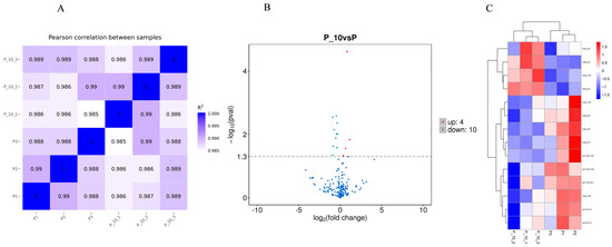The volcano map and heat map of the DE miRNAs are shown in Figure 2B and Figure 2C, respectively. According to the criteria of the p-value < 0.05, relative to the P group, 10 miRNAs were significantly downregulated, and 4 miRNAs were significantly upregulated in the P-10 group among all credible miRNAs. The relevant information for the DE miRNAs is shown in Table S2.