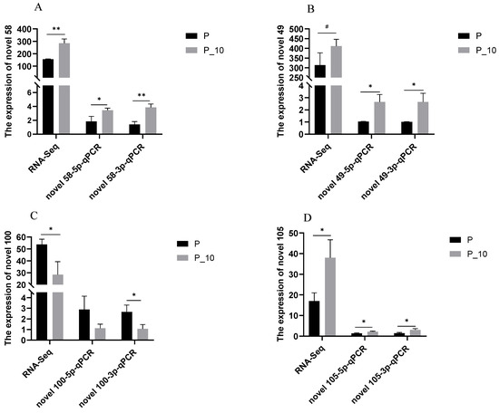 qPCR detection of novel 49-3p, novel 49-5p, novel 58-3p, novel 58-5p, novel 100-3p, novel 100-5p, novel 105-3p, and novel 105-5p in the P and P-10 groups was performed. The results confirmed the DE miRNAs (novel 49, novel 58, novel 100, and novel 105) between the P and P-10 groups, which followed the results acquired from the RNA-Seq (Figure 3). Thus, RNA-Seq can supply accurate results for DE miRNA investigations.